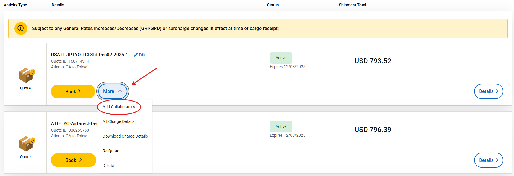 • Sharing a quote will allow collaborators to add the quote to their Activity Feed and book it