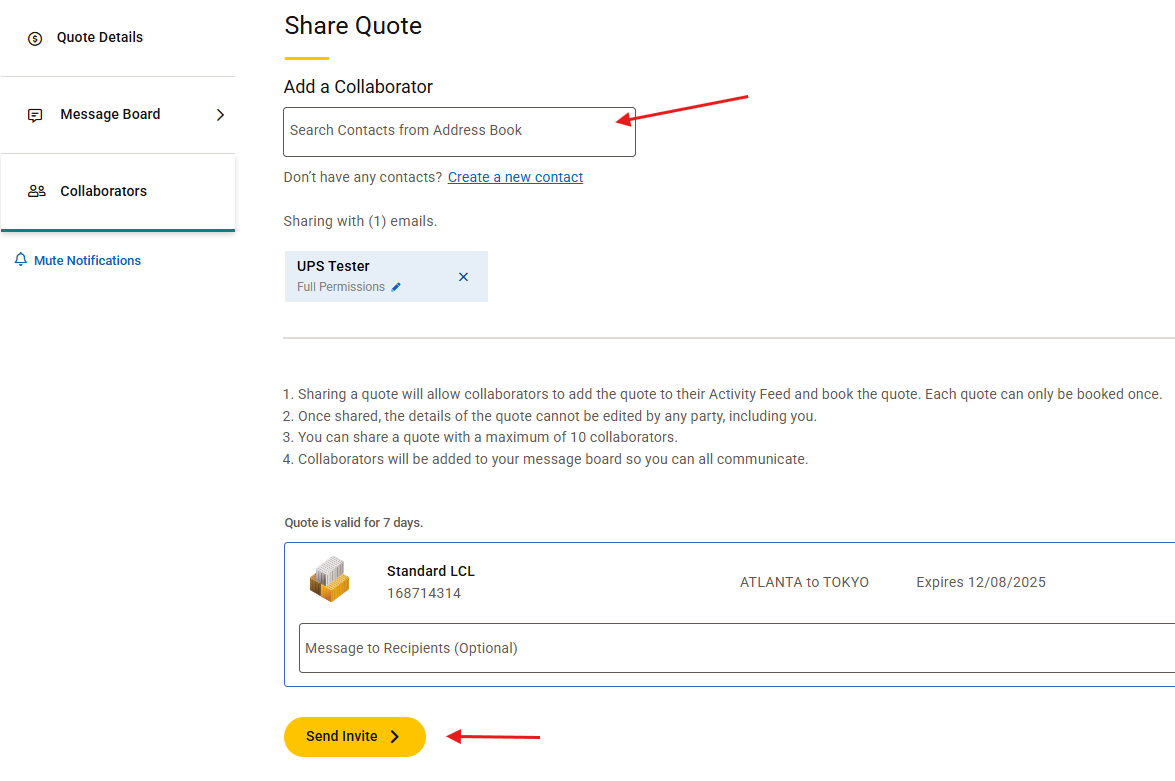 • Share a quote with a maximum of 10 collaborators